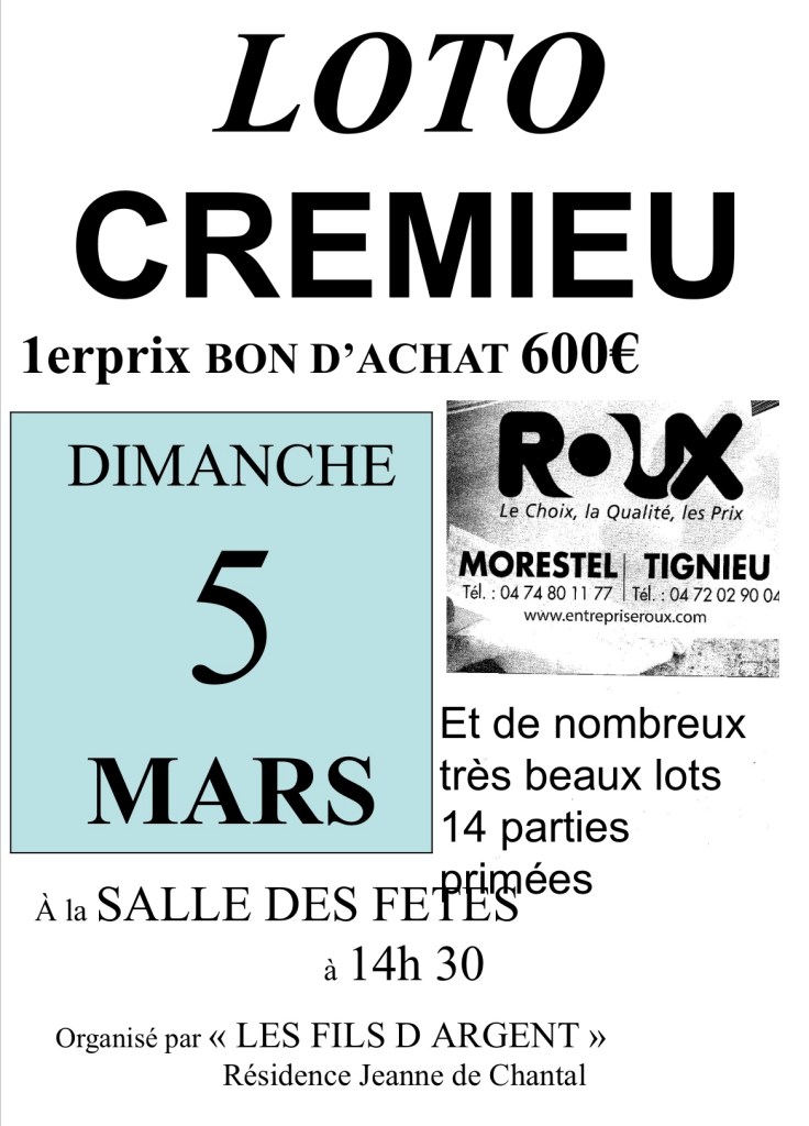 À la SALLE DES FETES à 14h 30 – Organisé par « LES FILS D’ARGENT » association qui œuvre pour le bien-être des résidents de la maison de retraite Résidence Jeanne de Chantal