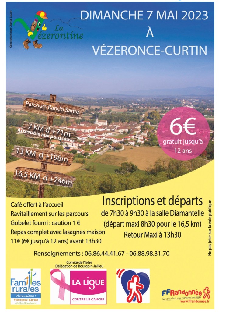 Info : 6ème édition de la « Vézerontine », la randonnée de village organisée par l’association Familles Rurales de Vézeronce-Curtin. dimanche 7 mai.