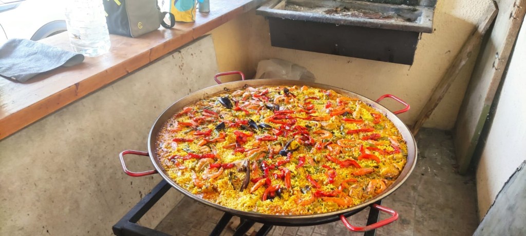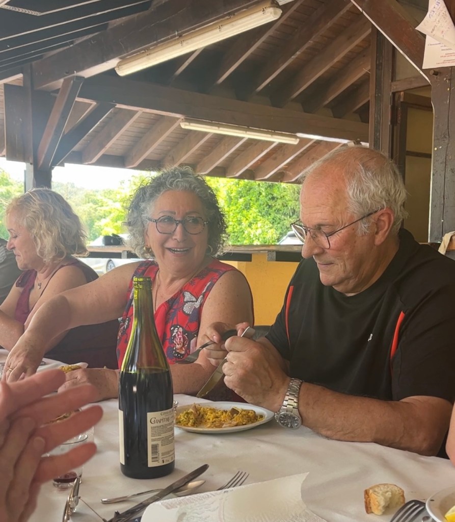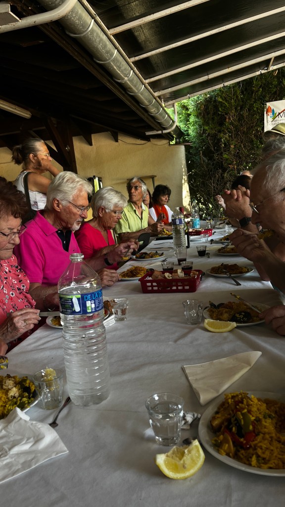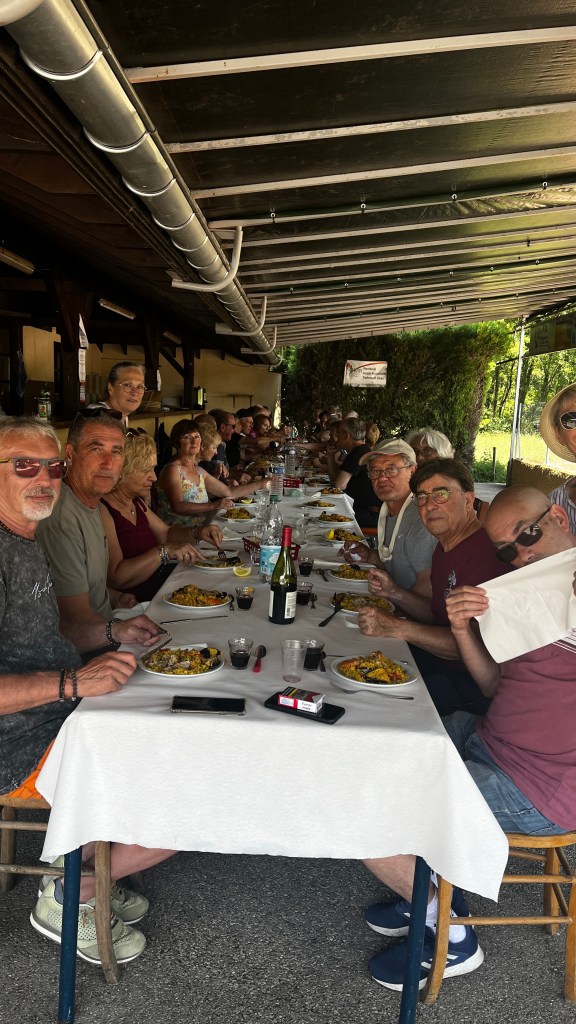 Au menu : Amuse-bouches apportés par les adhérents, sangria (l’abus de … etc…), puis une superbe paella mitonnée par Tony et son époux… de la salade… du fromage… un café gourmand avec des desserts confectionnés par les adhérents, délicieux…, sans oublier un trou normand (ouf !)