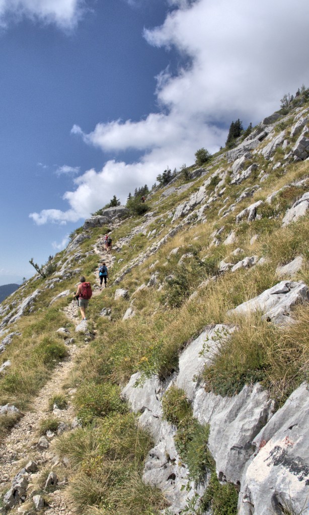 Le « som » est la monnaie officielle du Kirghizistan mais c’est aussi la réduction du mot sommet. Un charmant sommet, à 1867 m, voilà la randonnée qui nous attendait. Un dénivelé d’environ 850 m assez physique puisque la montée se fait pratiquement sans répit depuis Les Revols. Ce qui ne nous empêche pas de faire de courtes pauses et d’admirer des panoramas exceptionnels.