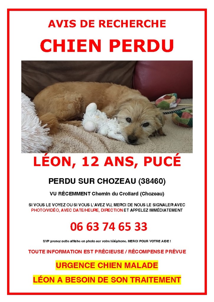 On nous signale ceci : à la recherche de Leon, chien qui a disparu à Chozeau le 22 janvier. C’est un croisé fauve de bretagne ou griffon. Il pèse 10 kilos c’est un petit chien. Merci !!