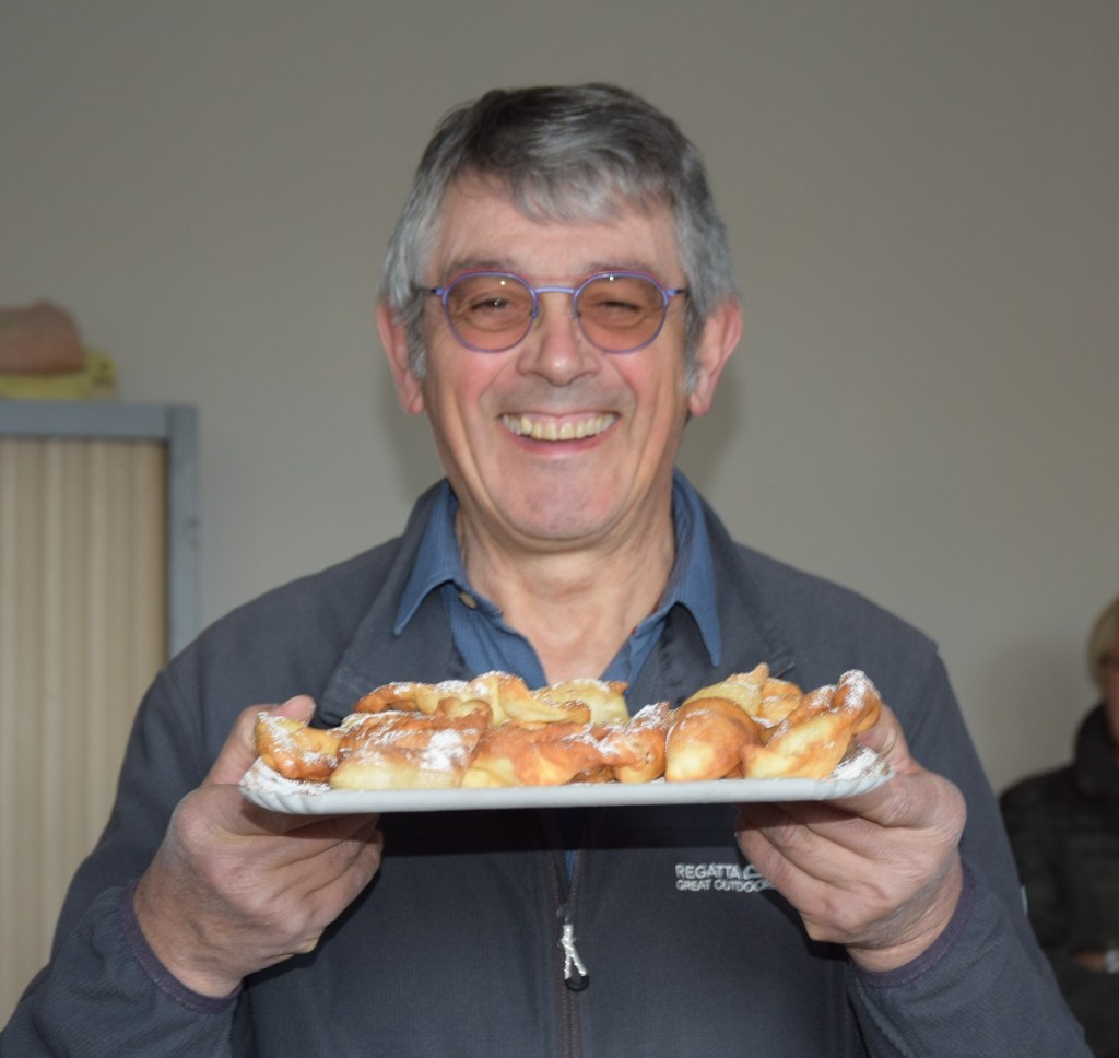 Les bugnes avaient été préparées le matin même, de 8h à midi, au domicile de Jean-Claude et de Jacqueline G, avec l’équipe de choc : Nicole Z, Denise C, Georges D, Jean-Luc H, Etienne R, Phillipe.