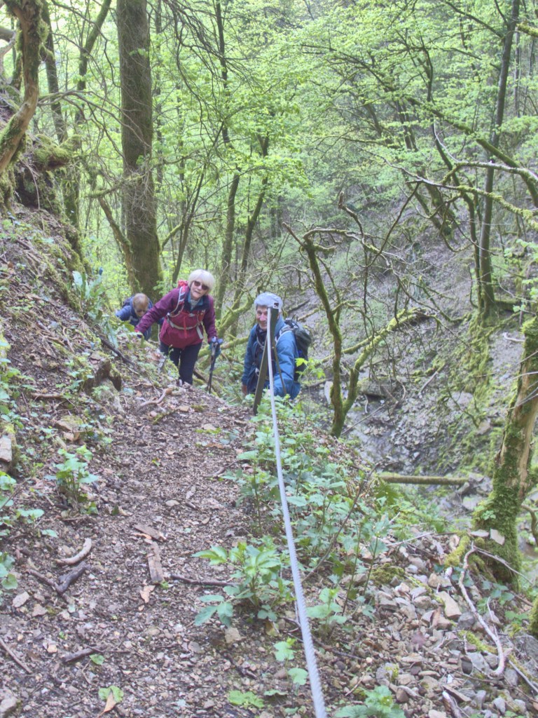 Randonnée qui a débuté par un petit échauffement sur un chemin plat avant d’attaquer le sentier du Crochet. Celui-ci, assez pentu et glissant, est entièrement sécurisé par des câbles solidement installés comme main courante. Le ressaut est équipé d’échelons scellés dans le rocher.