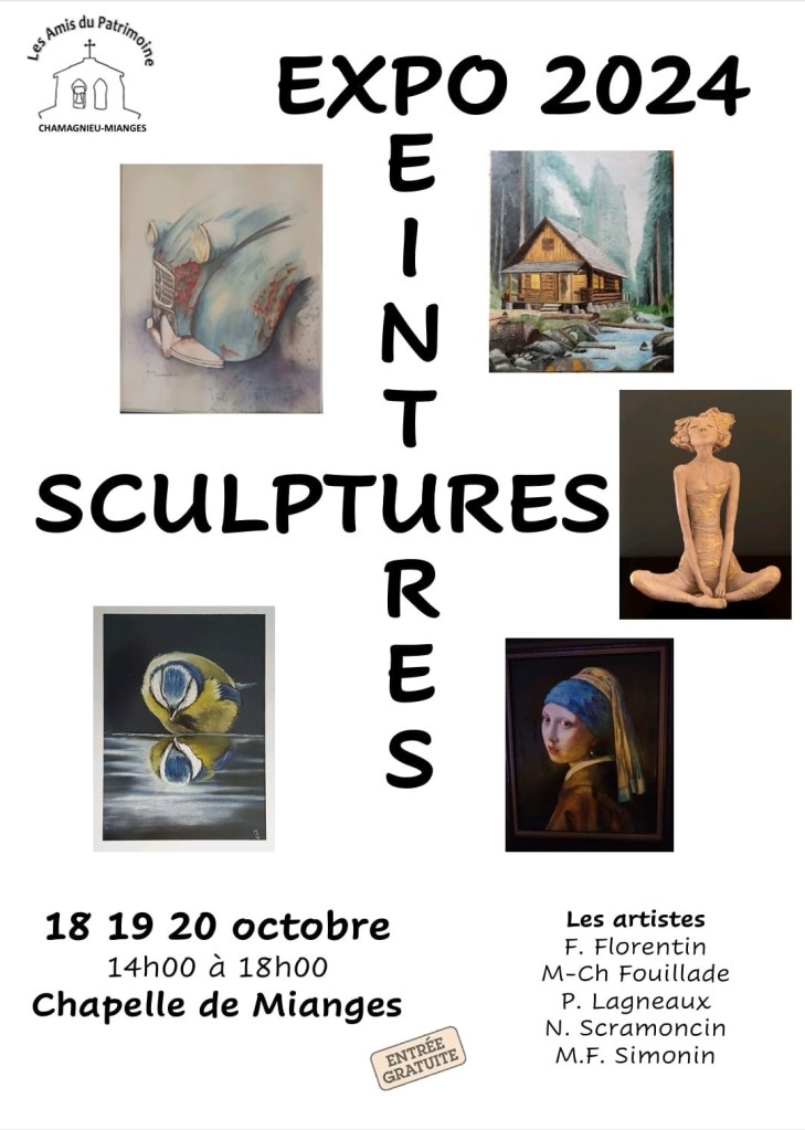 5 artistes, dont notre camarade Marie-Christine exposeront leurs peintures et sculptures. Profitez de votre déplacement à Crémieu pour notre randonnée de village de ce dimanche pour faire un crochet à la chapelle de Mianges. Exposition du 18 au 20 octobre 2024.