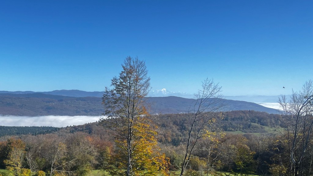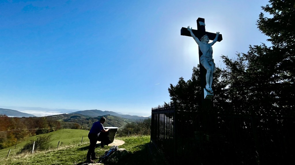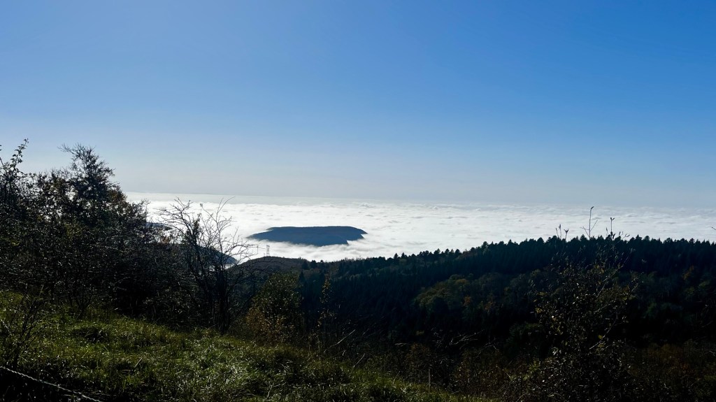 En montant, nous avons atteint le Calvaire de Portes où les nuages semblaient envelopper les collines en contrebas, créant une île isolée de brume en plein cœur du Bugey.