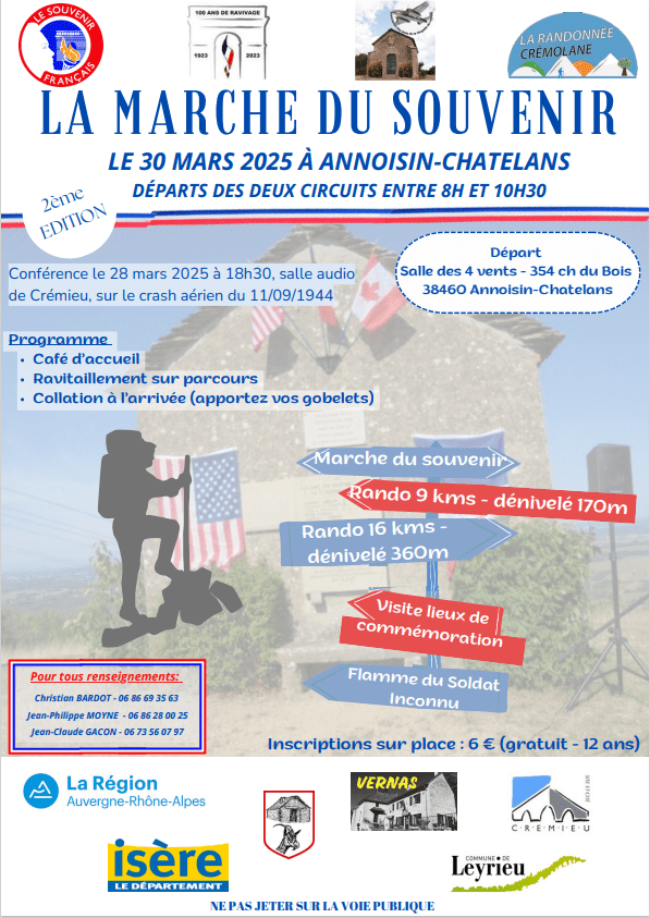 Dimanche 30 mars, marche du souvenir : deux randonnées de 9 et 16 km au départ d’Annoisin, café d’accueil, ravitaillement et collation à l’arrivée. Commentaires sur le parcours.