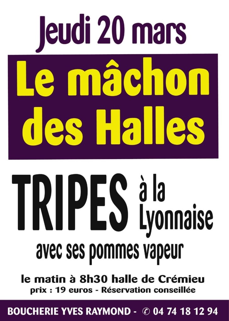 Pour ceux que ça intéresse : nous allons mâchonner sous la halle de Crémieu, jeudi 20 mars de 8h30 à 10h30 environ. Téléphoner à la boucherie Raymond pour réserver.