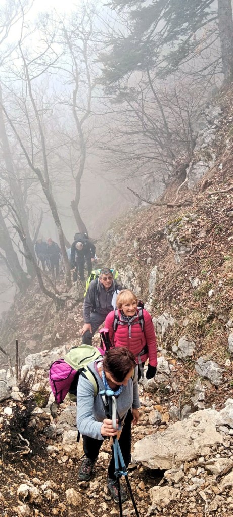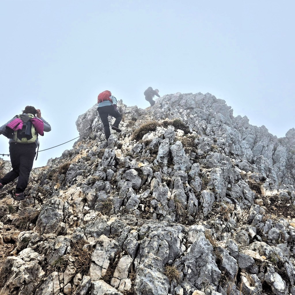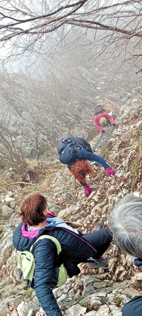 Mais les randonneuses et randonneurs ont toujours le sourire. Et ce n’est pas le caprice d’une météo qui ne tient pas ses promesses qui va les arrêter. Montée raide, passages acrobatiques avec câbles, ou échelles non plus !