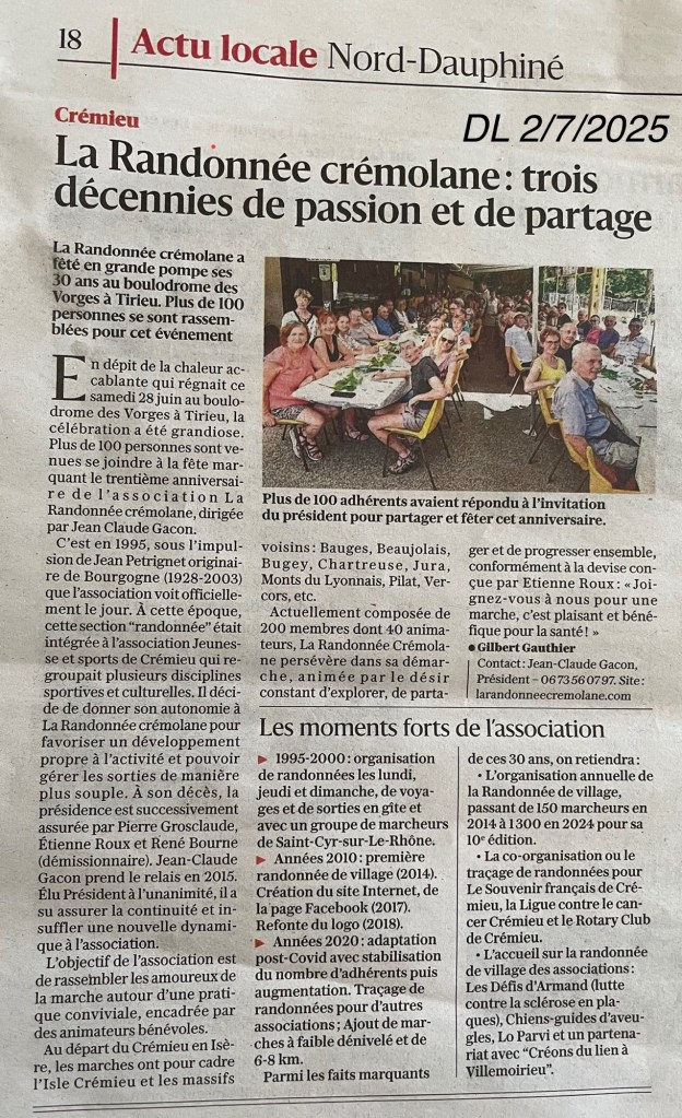 C’est en 1995 que M. Jean PETRIGNET, un passionné de montagne, décide de créer La Randonnée Crémolane. Pour fêter les 30 ans d’existence, une belle fête-anniversaire a été organisée le 28 juin 2025 au boulodrome de Courtenay (38).