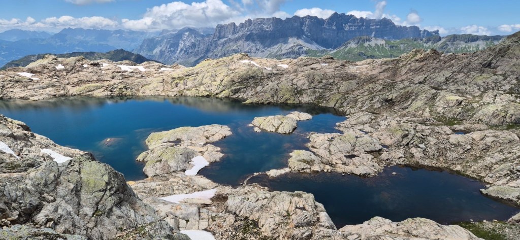 D’ordinaire, le versant nord garde de beaux névés tard en saison, mais cette année la canicule a tout effacé. Même la neige tombée quelques jours auparavant n’a pas tenu, ce qui rend notre progression plus aisée.