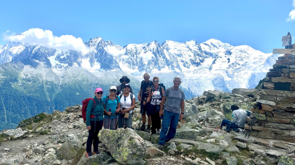 Face à nous, le Mont-Blanc trône majestueusement, promesse d’un panorama grandiose tout au long de la randonnée.
