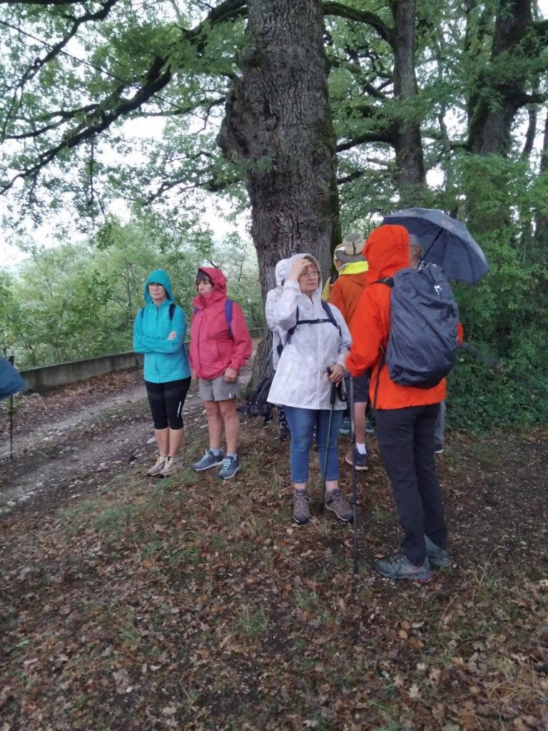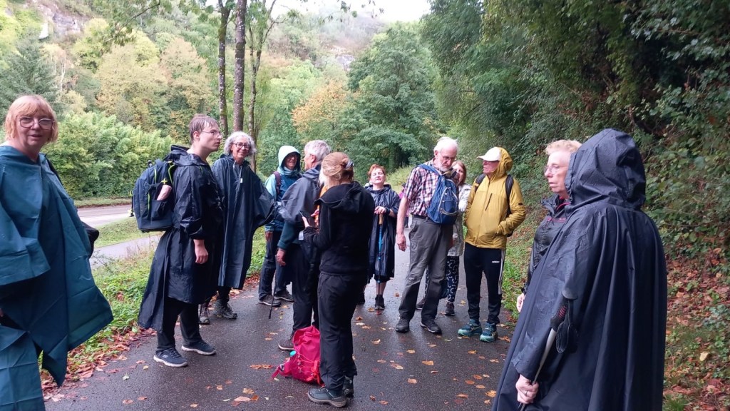 Rapidement, les capes de pluie et les capuches sont devenues indispensables : la pluie s’est invitée généreusement, arrosant le groupe tout au long du chemin.