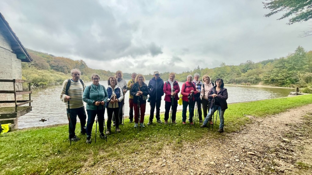 Après une montée douce, le sentier nous a menés jusqu’à l’étang de Bénétan, paisible et miroitant sous le ciel gris. C’est là que nous avons immortalisé ce moment : douze visages souriants, rassemblés par le plaisir simple de marcher ensemble.