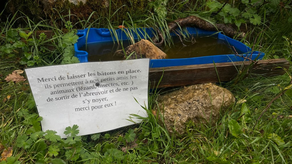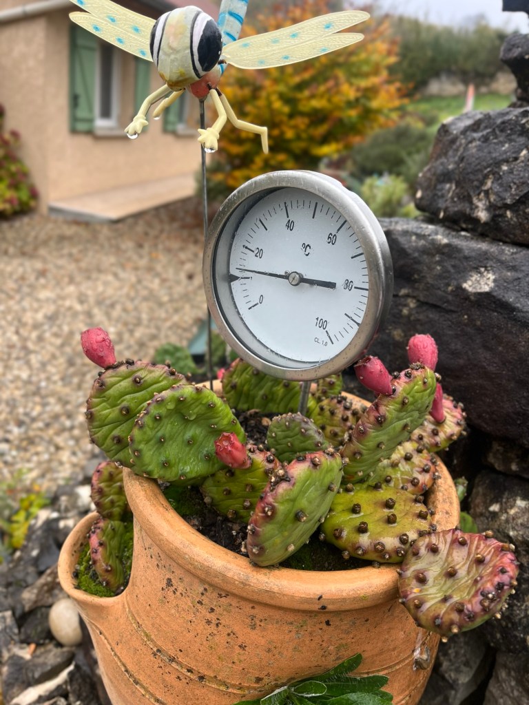 Une charmante décoration de bord de chemin rappelait subtilement la température du jour : « frais, voire frisquet » mais quand on marche, on a chaud 🥵
