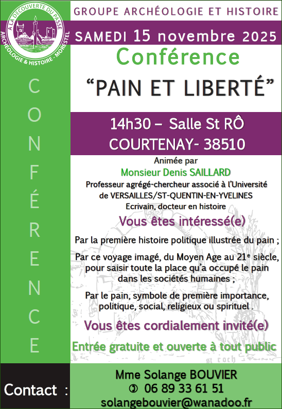 - Conférence, gratuite et ouverte à tout public, samedi 15 novembre 2025 ‘‘PAIN ET LIBERTE, le pain au cœur de notre histoire”, à COURTENAY – 38510, salle St RÔ, 14h30 (grand parking). Organisée par le groupe archéologie et histoire de Morestel. Contact : Solange BOUVIER – 06 89 33 61 51