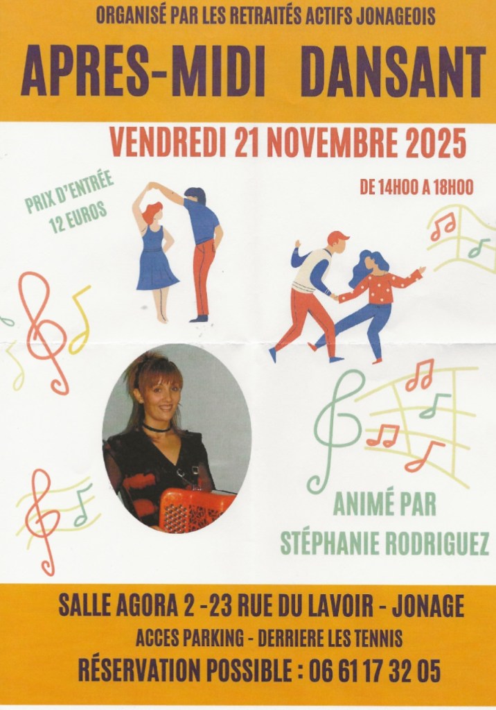 - L’un de nos adhérents, Serge DE BONIS, également président de « Retraités Actifs Jonageois » propose vendredi 21 novembre un après-midi dansant animé par l’accordéoniste Stéphanie RODRIGUEZ à JONAGE. E-mail