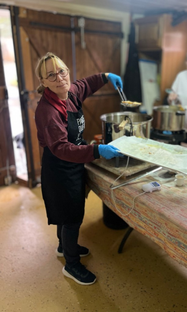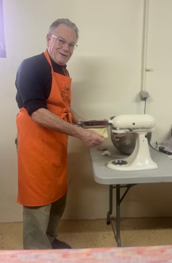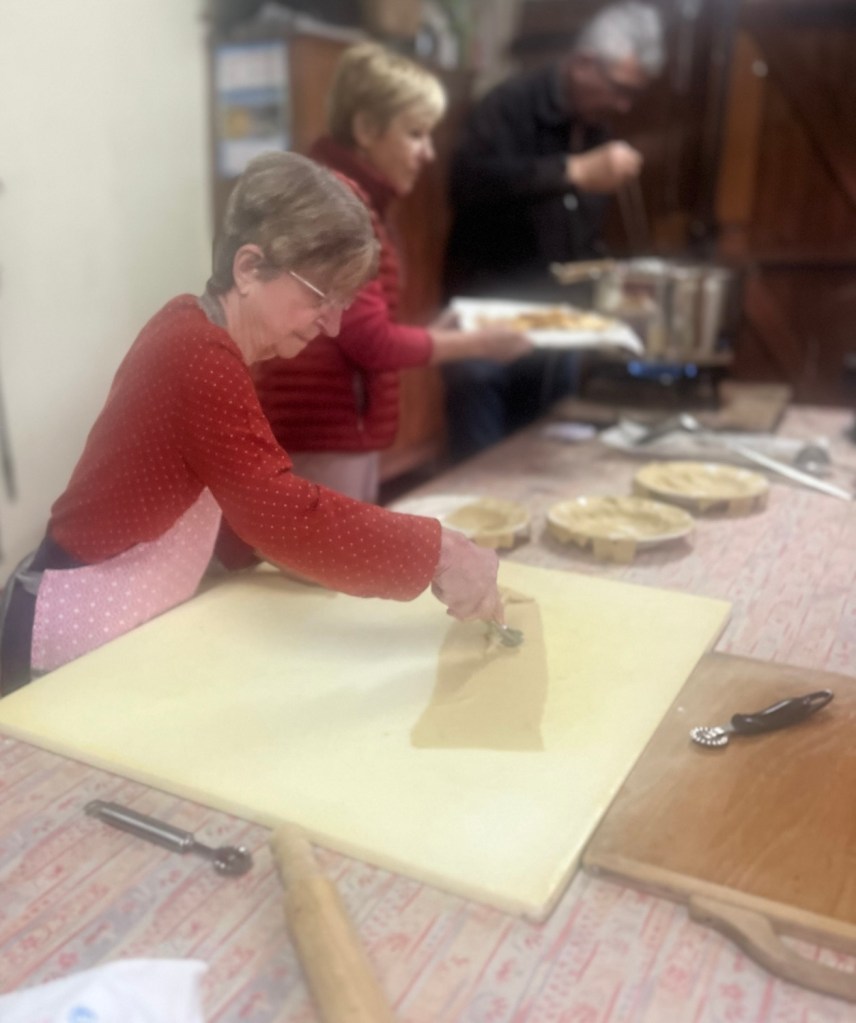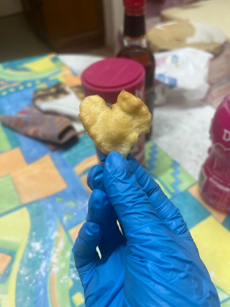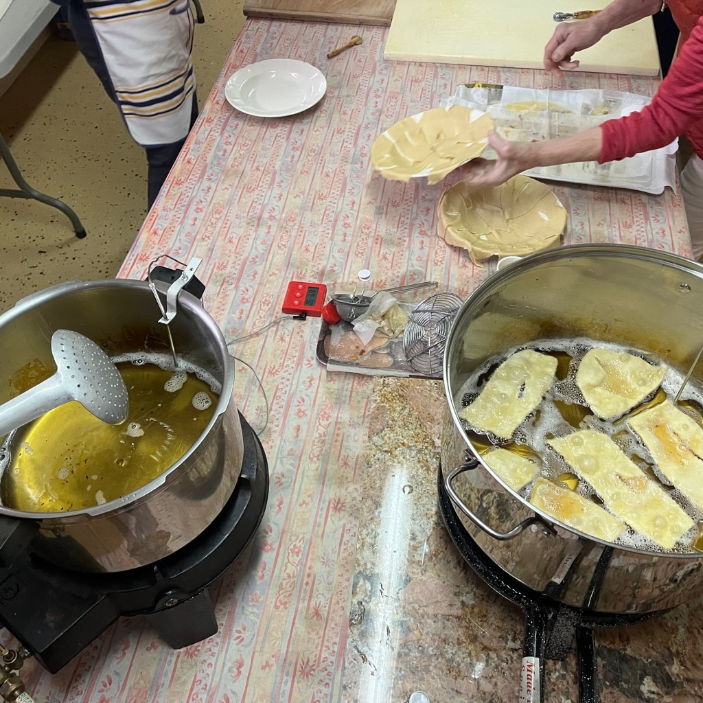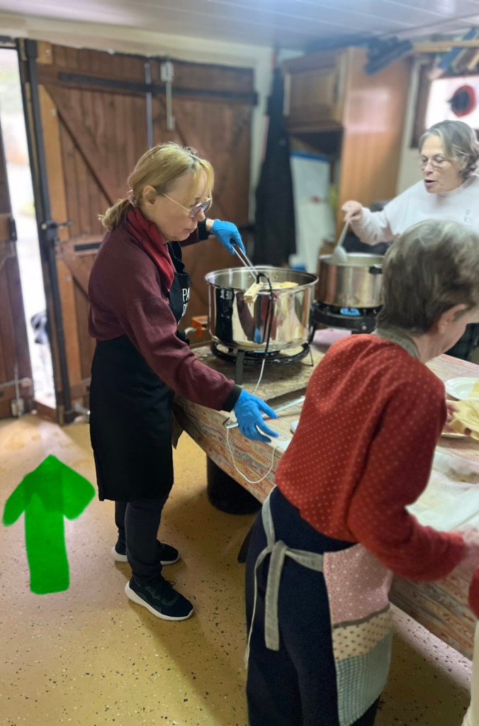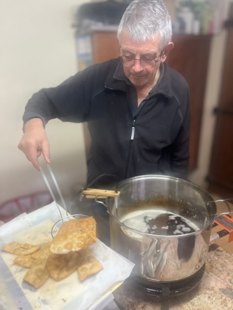 La pâte avait été préparée la veille sur les conseils aguerris de Bernard. Les bugnes ont été cuites ce matin même au domicile de Jacqueline et Jean-Claude (grand merci à eux !) avec Alice, Bernard, Denise, Marie-Laure, et Nicole.