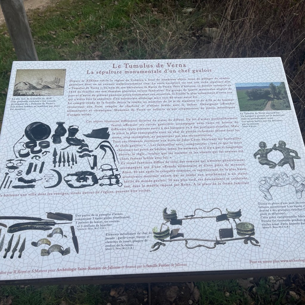 Nous avons également découvert l’emplacement nommé “le tumulus de Verna” où fut mise au jour la sépulture d’un puissant aristocrate gaulois, témoin remarquable de l’histoire locale. En savoir plus : https://app.geniusloci.com/places/tumulus-de-verna