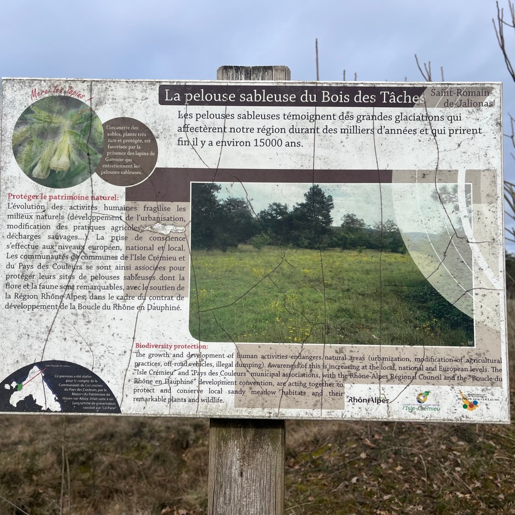 Nous avons effectué un aller-retour en empruntant d’abord la ViaRhôna, puis un sentier parallèle au Rhône et passant par la pelouse sableuse du Bois des Tâches.