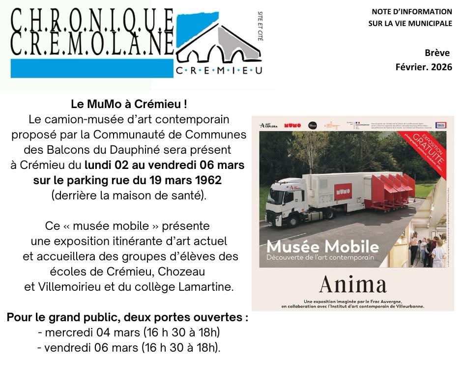 [EVENEMENTS] Théâtre, MuMo Musée mobile à Crémieu Publié le 2 mars 20261 mars 2026 par Alice MuMo Musée Mobile à Crémieu 4 et 6 mars 2026 Théâtre à Crémieu le 14 mars 2026 En savoir plus sur La Randonnée Crémolane Abonnez-vous pour recevoir les derniers articles par e-mail. Saisissez votre adresse e-mail… Abonnez-vous Partager : Imprimer(ouvre dans une nouvelle fenêtre) Imprimer Partager sur Facebook(ouvre dans une nouvelle fenêtre) Facebook J’aime chargement…