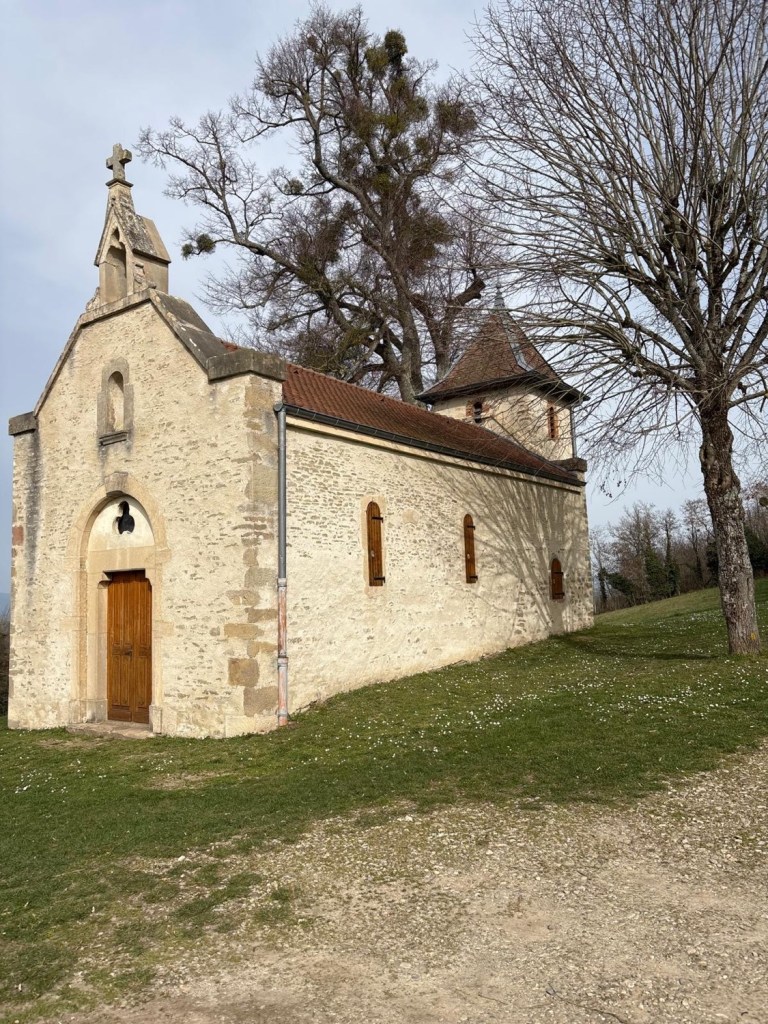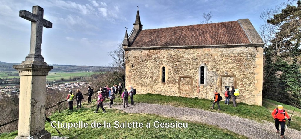 Par Cessieu et la Chapelle de la Salette (Implantée sur le site de l’ancien château du Chatelard), avec vue sur la plaine.