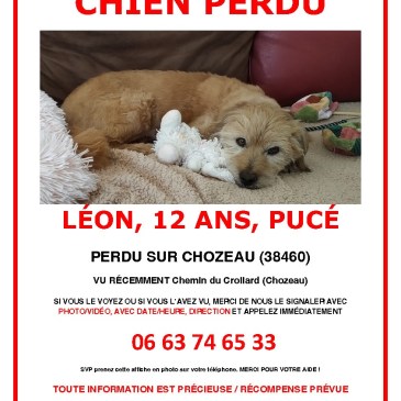 On nous signale ceci : à la recherche de Leon, chien qui a disparu à Chozeau le 22 janvier. C’est un croisé fauve de bretagne ou griffon. Il pèse 10 kilos c’est un petit chien. Merci !!