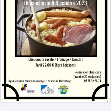 Choucroute royale + Fromage + Dessert Tarif 22.00 € (hors boissons)Réservation obligatoire (avant le 20 septembre) Organisée par le comité de jumelage « Les amis de Hüttenberg »